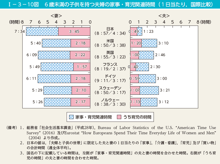 I-3-10図 6歳未満の子供を持つ夫婦の家事・育児関連時間(1日当たり,国際比較) | 内閣府男女共同参画局